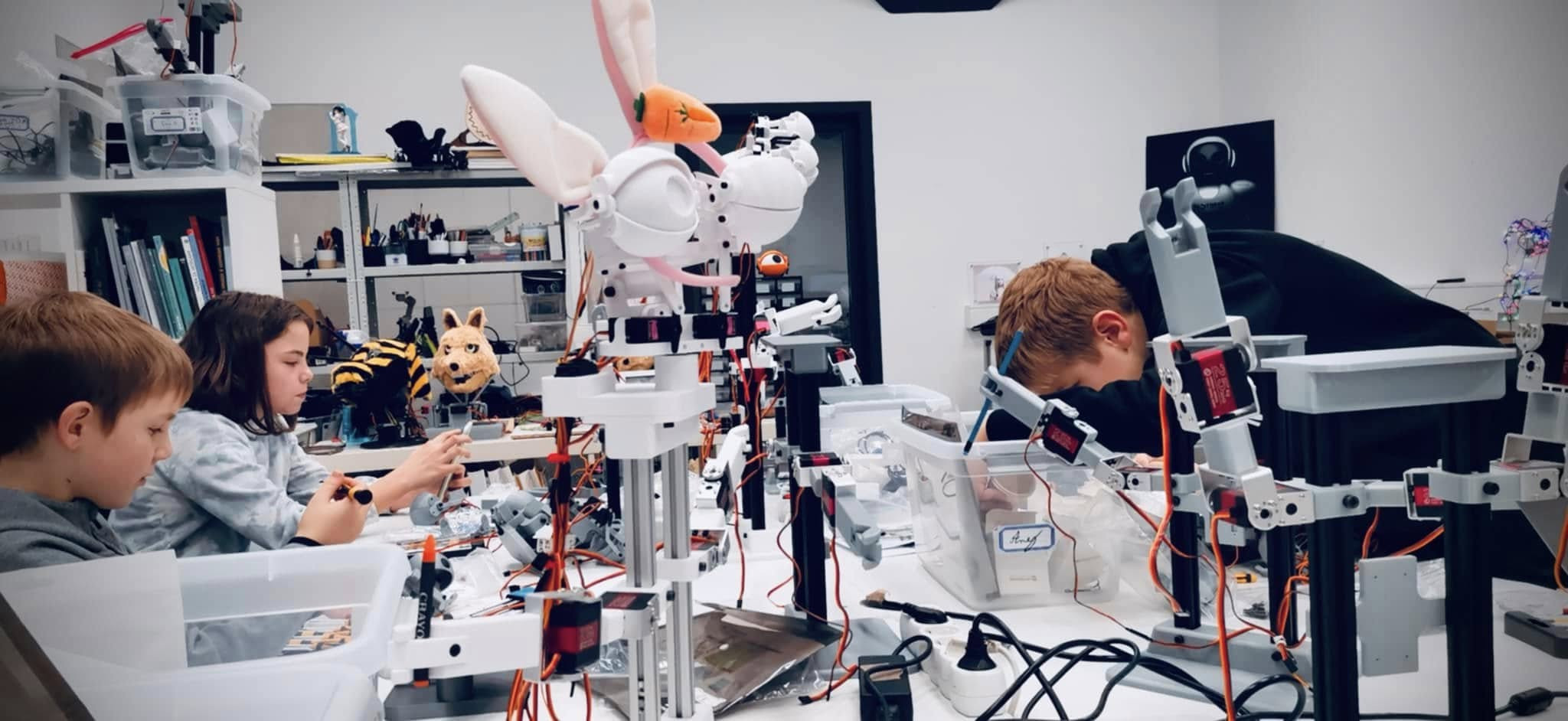 Projekt DIY robotkov (naredi-sam robotkov) združuje 3D tisk, elektronske vezja in servo motorje za ustvarjanje interaktivnih robotov. Namenjen je učenju robotike s poudarkom na animatroniki, kjer se udeleženci učijo sestavljanja robotskih komponent, vijačenja, kalibriranja servo motorjev in animiranja gibljivih delov.